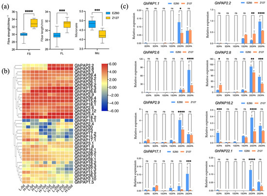 Expression profile of GhPAP genes in the fiber of upland cotton. (a) Fiber quality traits of the two cotton varieties EZ60 and CCRI127. (b) Expression profile of GhPAP genes in the fiber of two upland cotton plants EZ60 (low FL and FS) and CCRI127 (high FL and FS). The values in the figure represent log2 (TPM). (c) Relative expression profile of GhPAP genes in different groups. The error bars represent the SDs. An asterisk (*) indicates significance at p < 0.05, two asterisks (**) indicate significance at p < 0.01, three asterisks (***) indicates significance at p < 0.001, four asterisks (****) indicate significance at p < 0.0001, (ns) indicates no significance.
