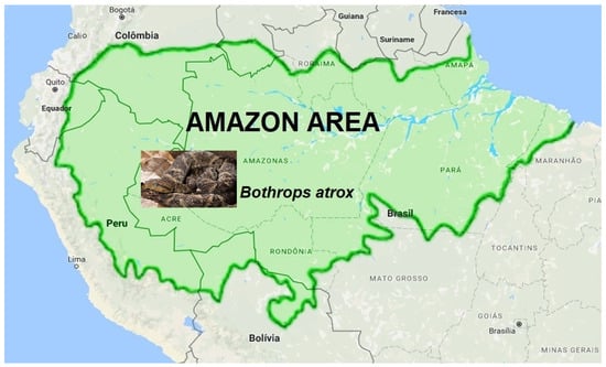 Figure 1 denotes part of the South American continent, with the northern part of Brazil’s borders, showing the typical snake of this area, B. atrox [,]. Like the other snakes from the genus Bothrops, proteomic studies of the B. atrox venom present and a low amount of PLA2 and the predominant presence of metalloproteinases (SVMPs)—more than 30%—producing intense hemorrhage, bleeding disorders, and edema [,,,,,,,]. Furthermore, it is considered the most critical snake involved in human envenoming in the Amazon, which induces severe tissue hemorrhage [,,,].