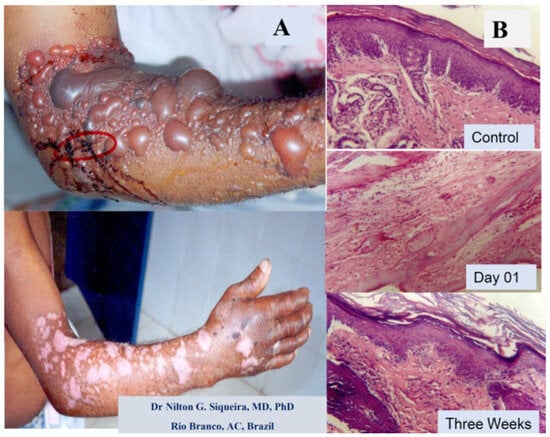 An example of a human snakebite and experimental investigation are shown in Figure 2, with a picture of a damaged arm from a male Amazon worker from Acre state, Brazil, after a Bothrops snakebite. The patient arrived without any previous treatment, with a large skin injury, presenting blisters, edema, and late scars resulting from the necrotic and inflammatory reactions induced by the venom components (Figure 2A). The figure also shows the results of the experimental light microscopy of mouse skin before and after Bothrops jararaca venom injection (Figure 2B).
