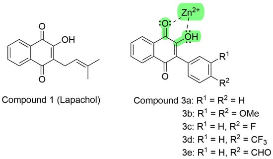 Lapachol chemical structure and its synthetic analogs show the possible pharmacophoric Moyet that can target metalloproteinases (modified from Strauch et al. []).
