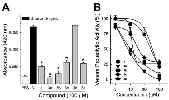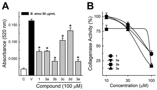 Collagenase activity of B. atrox venom, and the effect of Lapachol and analogs. (A) The inhibition of B. atrox venom (50 μg/mL) by Lapachol (1) and analogs (numbers 3a, 3b, 3c, 3d, and 3e) at 100 μM (n = 5). (B) The inhibition of venom collagenase activity by compounds 1, 3a, 3b, and 3e in a concentration-dependent way (n = 5). For all data, one-way ANOVA Dunnett’s post hoc test, * p < 0.05, versus B. atrox venom (modified from Strauch et al. []).