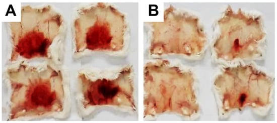 Skin hemorrhage caused by Bothrops atrox venom and the effect of Lapachol analogs. Panel (A) shows images of the hemorrhagic effect of Bothrops atrox venom (1 mg/kg) in mouse skin, demonstrating skin hemorrhage after the intradermic injection; panel (B) demonstrates skin hemorrhage after the intradermic injection of venom in the presence of analog 3a (1 and 3 mg/kg). The quantification data are presented in Figure 8A.