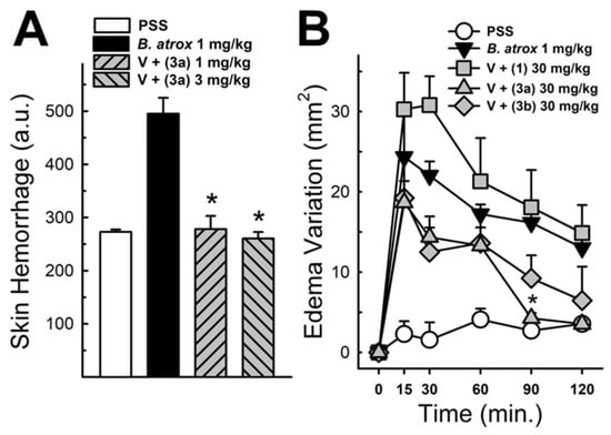 Panel (A) shows the hemorrhagic activity of B. atrox venoms in mouse skin: the effect of analog 3a. The data demonstrate skin hemorrhage after the intradermic injection of venom in the presence of analog 3a (1 and 3 mg/kg). One-way ANOVA Dunnett’s post hoc test, * p < 0.05, versus B. atrox venom (n = 8). Panel (B) shows the B. atrox edematogenic activity in mice after a tight injection, alone or associated with analog 3a or Lapachol (30 mg/kg). On panel (B) One-way ANOVA Dunnett’s post hoc test, * p < 0.05, versus B. atrox venom (n = 5) (modified from Strauch et al. []).