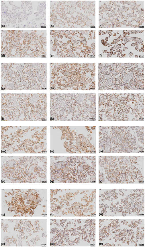 FFPE slides (4 µm thick) of placenta tissues were IHC-stained with antibodies against subunits of each of the five OXPHOS complexes and VDAC1. IHC was performed as previously described [,] using the Dako Envision Detection System with Peroxidase-Blocking Solution (Agilent Technologies; Inc., Santa Clara, CA, USA; S2023), DAB+Substrate Chromogen (Agilent Technologies; Inc., Santa Clara, CA, USA; K3468), EnVision+ System− HRP Labelled Polymer Anti-mouse (Agilent Technologies; Inc., Santa Clara, CA, USA; K4001). All the antibodies were diluted in Dako Antibody Diluent with Background-Reducing Components (Agilent Technologies; Inc., Santa Clara, CA, USA; S3022). The following antibodies were used: mouse monoclonal anti-VDAC1 (1:1000; Abcam; Cambrige, UK; Ab14734); mouse monoclonal anti-nicotinamide adenine dinucleotide hydrogen (NADH): oxidoreductase subunit S4 (NDUFS4) (1:500; Sigma-Aldrich/Merck KGaA; Darmstadt, Germany; WH0004724M1); mouse monoclonal anti-succinate dehydrogenase complex flavoprotein subunit A (SDHA) (1:1000; Abcam; Cambrige, UK; Ab14715); mouse monoclonal anti-ubiquinol-cytochrome c reductase core protein 2 (UQCRC2) (1:1000; Abcam; Cambrige, UK; Ab14745); mouse monoclonal anti-mitochondrially encoded cytochrome c oxidase I subunit (MT-CO1) (1:1000; Abcam; Cambrige, UK; Ab14705); and mouse monoclonal anti-ATP synthase F1 subunit A (ATP5F1A) (1:1000; Abcam; Cambrige, UK; Ab14748). The slides were incubated with the respective antibody solutions for 1 h at room temperature. The staining intensity was analyzed using a score system from 0 to 3: no staining = 0; weak staining = 1; moderate staining = 2; and strong staining = 3 (Figure 1).