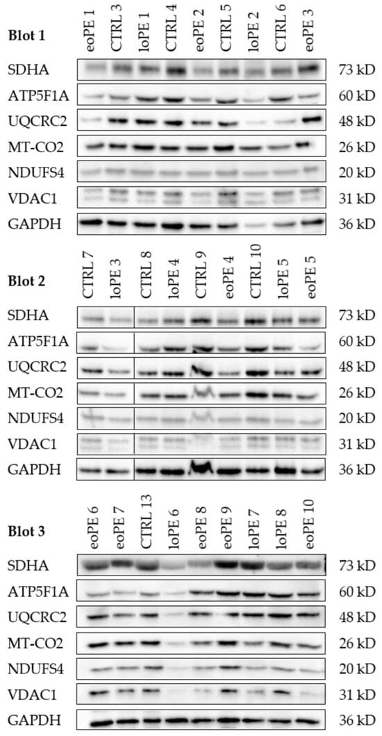 This study did not identify any significant differences between controls, eoPE, and loPE in relation to the mitochondrial amount as ascertained by three different methodologies: IHC, WB, and spectrophotometry (Figure 3). Our findings are in agreement with a previous study that shows equivalent VDAC1 expression in controls, eoPE, and loPE []. In contrast, in the same study, a significant higher in CS activity in loPE and eoPE and mtDNA copy number in eoPE was reported compared to controls []. The exact values for the median mtDNA and CS were not specified, but the differences between the groups were minor. In contrast, two other PE studies reported a significantly lower mtDNA copy number and CS activity [,], arguing for a diminished mitochondrial mass. Surprisingly, the O2 flux via complex I and complex I + II was higher in those studies []. Consistent with the diminished CS activity, the authors found a downregulation of all complexes in WB in the pre-term groups. Due to analyzing the total and relative mitochondrial amount, using three different methods, our study could rule out any significant or pathologically relevant changes in mitochondrial biogenesis during pregnancy.