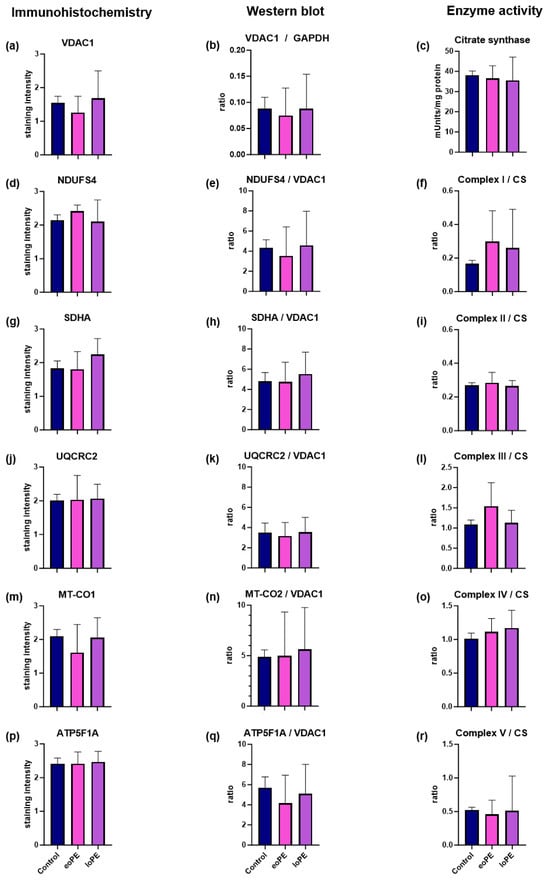 Comparison of total and relative amounts of OXPHOS subunits and OXPHOS enzyme activity in placentas of eoPE, lope, and controls. (a,d,g,j,m,p) IHC staining of VDAC1, NDUFS4 (complex I), SDHA (complex II), UQCRC2 (complex III), MT-CO1 (complex IV), and ATP5F1A (complex V) in placentas from controls, eoPE and loPE pregnancies; (b) WB analysis of VDAC1 levels normalized to GAPDH as a loading control; (e,h,k,n,q) WB analysis of NDUFS4 (complex I), SDHA (complex II), UQCRC2 (complex III), MT-CO2 (complex IV), and AT5F1A (complex V) normalized to VDAC1 as a mitochondrial loading control in controls, eoPE and loPE; (c) absolute activity of CS as a marker for the mitochondrial mass; (f,i,l,o,r) enzyme activities of complex I, II, III, IV, and V normalized to CS in eoPE, lope, and controls. Data are presented as mean ± standard deviation.
