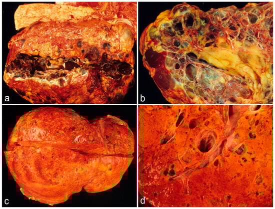 Adult ADPKD. This panel of four gross photographs shows Autosomal Dominant Polycystic Kidney Disease (ADPKD) in a young man harboring a mutation of the PKD1 gene at autopsy. Multiple cysts of the kidneys (right kidney, displayed, left kidney not displayed), some of them hemorrhagic, are shown (a,b). Histological examination of the kidneys did not show any evidence of carcinoma. Interestingly, this patient showed early severe atherosclerosis of the blood vessels, which is particularly demonstrated in (a) at the level of the thoracic and lumbar aorta. This patient showed also multiple liver cysts, as demonstrated in (c,d), but obviously the number of the cysts of the liver is inferior to the number of cysts of the kidneys. The gross photographs come from the personal archive of Dr. Sergi.
