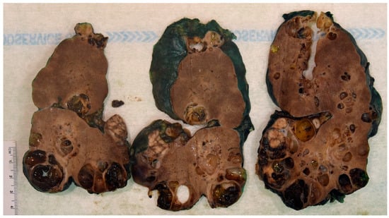 - Nezu, K.; Sakai, T.; Kuromoto, A.; Kanno, H.; Sato, M.; Numahata, K.; Hoshi, S. A Case of Autosomal Dominant Polycystic Kidney Disease (ADPKD) with Metastases from Bilateral Small Renal Cell Carcinoma. Hinyokika Kiyo. 2016, 62, 313–316. Available online: https://www.ncbi.nlm.nih.gov/pubmed/27452494 (accessed on 19 March 2025).