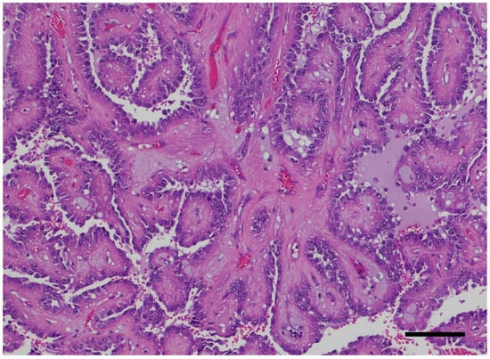 High-power microphotograph of a multifocal renal cell carcinoma showing a mainly papillary growth pattern. The nuclear morphology is Fuhrman grade 2 (Hematoxylin and Eosin Staining, ×100 original magnification, bar: 100 μm). The microphotograph comes from the personal archive of Dr. Sergi.