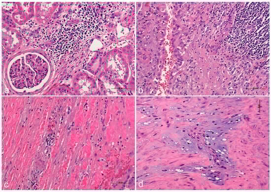 Inflammation in ADPKD-RCC. Inflammation with mononuclear cells is seen in periglomerular regions (a), destroying the interstitial renal parenchyma in (b), percolating collagen fibers (c), and as scattered inflammatory cells in a myxoid or myxoid-like background (d) (Hematoxylin and Eosin Staining, ×100 original magnification; bar values are disclosed in the microphotographs). All microphotographs come from the personal archive of Dr. C. M. Sergi.