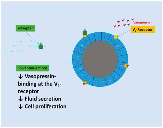 The pathophysiology of ADPKD is affected by several physiological alterations brought about by tolvaptan’s V2 receptor antagonism in the renal collecting ducts on reaching the kidney level [,,,,]. It raises the serum Na+ concentration and lowers the urine osmolality, and it induces free water excretion, leading to net body fluid loss []. Another benefit of V2 antagonism is a the slowing ADPKD progression due to a reduction in cyst proliferation caused by cAMP [,,,].