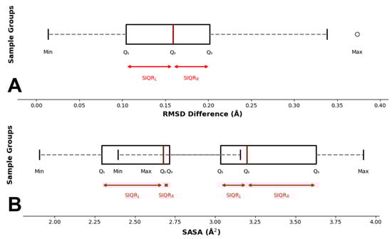 The statistical analyses in this study focused on analyzing the RMSD of binding residues and ligands and SASA of the binding residues across 100 protein–ligand complexes. The extent of fluctuation in the RMSD values over the simulations was computed for each binding residue and ligand, respectively. The range was determined by the difference between the maximum and minimum RMSD values observed for each residue during MD simulations. Additionally, a statistical analysis of SASA has been performed. The range of the minimum SASA values across all binding residues was calculated and graphically analyzed, offering insights into the solvent exposure during ligand binding. The same analysis was made with the range of maximum SASA values, showcasing the variability in solvent exposure of binding residues throughout the MD simulations.