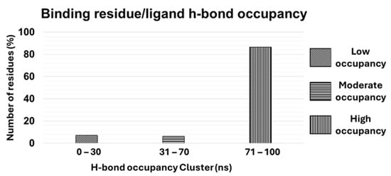 The analysis of hydrogen bond occupancy reveals that 86.5% of binding residues maintain high-occupancy hydrogen bonds (71–100 ns) with the ligand throughout the simulations. This finding underscores the importance of stable, high-occupancy interactions in driving ligand binding and stability. Key implications include the validation of docking poses considering the high-occupancy hydrogen bonds serve as a critical validation metric for docking poses. Ligands that form stable hydrogen bonds with binding residues are more likely to exhibit strong binding affinity, making this metric a valuable tool for evaluating docking results; thus, an important aspect of our results is the quantification of the hydrogen bond occupancy, and this study provides a novel and practical approach for assessing the stability of protein–ligand interactions, which can be applied to other systems to improve docking accuracy.