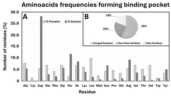 Figure 3A). When we clustered these residues based on their chemical and physical properties, an intriguing pattern emerged: charged residues (both positively and negatively charged) accounted for more than half of all residues within the binding pockets (56%). In contrast, non-polar and polar uncharged residues were less frequent, comprising 25% and 19% of the binding pocket residues, respectively (