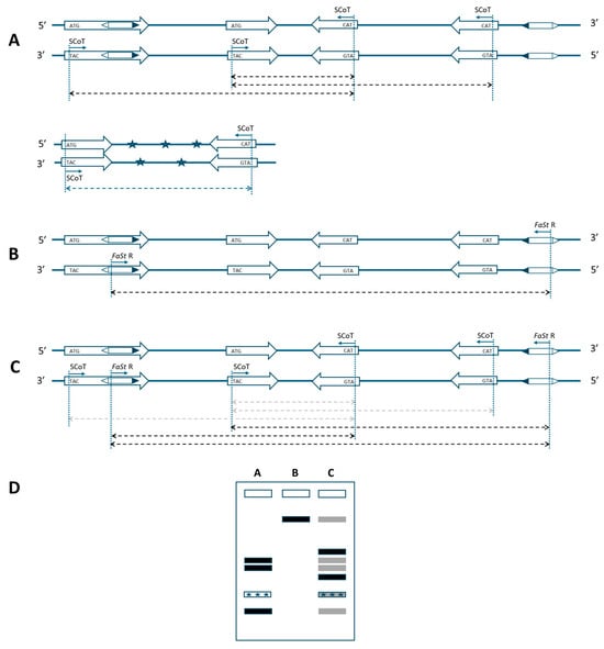 TNB was lower, while NDB was slightly higher for the SCoT–FaSt combinations compared to the SCoT-only analyses. The fewer bands detected across a broader range of size categories spanned amplicon sizes from 150 to 8000 bp. This extended range included both smaller and larger fragments than those amplified by SCoT primers alone in several other plants, such as Citrus, Punica, and Simmondsia species [,,]. The inclusion of FaSt-R primers reduced the gel pattern density, facilitating the more reliable identification of differentially expressed fragments. FaSt-R was specifically designed to anneal within the unique loop sequence of the non-autonomous transposon [], enabling the detection of complete or partial FaSt copies within the Prunus genome. This specificity significantly reduces the number of amplicons, especially considering that the peach genome contains approximately 28,000 protein-coding genes [] and around 1000 FaSt copies. The observed decrease in TNB and the changes in band sizes suggest that FaSt-R primers enhance the specificity of the PCR reaction. As expected, amplification using only SCoT primers will be less intense when FaSt-R is also available (Figure 1D). Additionally, SCoT primers can sometimes amplify gene fragments from pathogenic organisms infecting the host plant [,]. However, by incorporating FaSt-R, which selectively anneals to a Prunus-specific transposon, non-target amplicons that could interfere with the genetic analysis of crop plants are effectively excluded.