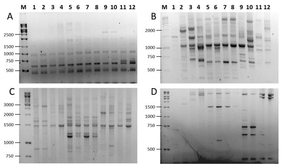 PCR amplification patterns in six Prunus species using SCoT and combined SCoT (forward) and FaSt-R (reverse) primers. (A) SCoT23 alone; (B) SCoT23 and FaSt-R; (C) Scot27 alone; (D) SCoT27 and FaSt-R. Lanes are labeled as follows: (M) GeneRuler 1 kb DNA ladder, P. armeniaca (1) ‘Ceglédi óriás’ and (2) ‘Gönci magyar kajszi’; P. dulcis (3) ‘Tuono’ and (4) ‘Tétényi keményhéjú’; P. cerasus (5) ‘Kántorjánosi 3′ and (6) ‘Feketicsi meggy’; P. avium (7) ‘Canada giant’ and (8) ‘Katalin’; P. persica (9) ‘Collins’ and (10) ‘Condor’ P. domestica (11) ‘Toptaste’ and (12) ‘Haroma’.