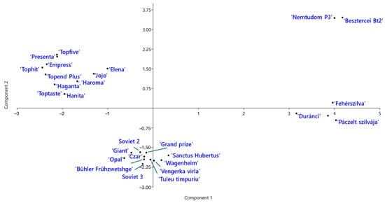 Genetic relationships among the P. domestica cultivars were further explored using principal component analysis (PCA) (Figure 5). The first two components explained 23.8% and 14.8% of total genetic variation, respectively. The PCA plot revealed four distinct groups of cultivars. ‘Jojo’ and ‘Elena’ clustered with the modern German cultivars, suggesting genetic similarity. Notably, the two Hungarian landraces, ‘Besztercei Bt2’ and ‘Nemtudom P3’, were located near each other but clearly separated from the remaining Hungarian landraces along the second principal component.