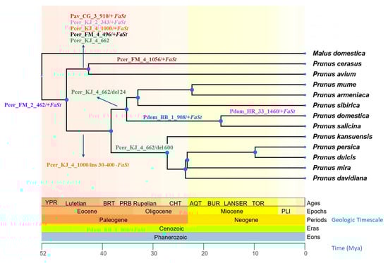 Chronogram of 12 Prunus species and one Malus species based on divergence time estimation from the TimeTree 5 database []. The geological timescale is indicated by background colors and shown in millions of years ago (Mya) below the cladogram. Arrows indicate Falling Stones (FaSt) transposon-induced sequence alterations (+ presence and − absence of FaSt; “ins” and “del” refer to other sequence insertions and deletions, respectively). Sequence identifiers are provided in Table S1.