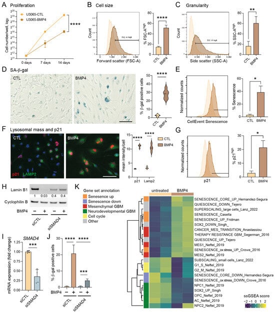 The BMP4-SMAD signaling pathway induces cell-size enlargement and a senescence-like phenotype in GBM cell cultures. (A) Proliferation curves of U3065MG cells (cells counted on days 0, 7 and 14), untreated (CTL) or treated with BMP4 (10 ng/mL). Unpaired t-test, ****, p < 0.0001. (B–J) U3065MG cells treated +/−BMP4 for two weeks. (B,C) Histograms (left) showing cell-size measurement (B) and granularity (C) using flow cytometry forward scatter (FSC-A) and side scatter (SSC-A) area values, respectively, and the quantification (right) of the FSC-A and SSC-A high populations of quadruplicate experiments. Unpaired t-test, ****, p < 0.0001; **, p = 0.0015. (D) Left, photographs of U3065MG cells +/−BMP4 stained for SA-β-gal—scale bar 100 µm; right, the quantification of SA-β-gal-positive cells. ****, p < 0.0001. (E) Histograms of cells stained for SA-β-gal (CellEventSenescence kit, Cell Signaling Technology, Danvers, MA, USA) and analyzed by flow cytometry, left; and the quantification of the CellEventSenescence high cell population (gate in histogram) from two experiments, right. *, p ≤ 0.05. (F) p21 and lysosomal marker LAMP2 immunofluorescence staining (left) and quantification (right). ****, p < 0.0001. (G) Histograms of cells stained with p21 antibody and analyzed by flow cytometry, left; and the quantification of cells with high p21 expression (two experiments), right. *, p ≤ 0.05. (H–J) SMAD4 knockdown experiment in U3065MG using siRNA for 14 days +/−BMP4 (12 days). siCTL, non-targeting control siRNA. (H) Lamin B1 protein levels using Western blot analysis. The quantification of protein-band intensities is shown, with values normalized to loading control cyclophilin B. (I) SMAD4 mRNA expression using qRT-PCR analysis. Two experiments, unpaired t-test, ***, p = 0.0004. (J) The quantification of SA-β-gal positive cells in SMAD4 knockdown experiment. See Supplementary Figure S1D for photographs. Unpaired t-test, ***, p < 0.001; ****, p < 0.0001. (K) A heatmap of single-sample GSEA (ssGSEA) using gene sets related to senescence, quiescence, GBM subtypes, GBM multitherapy resistance, cell size, and cell cycling on transcriptome data from untreated or BMP4-treated (14 days) U3065MG cells—two experiments.