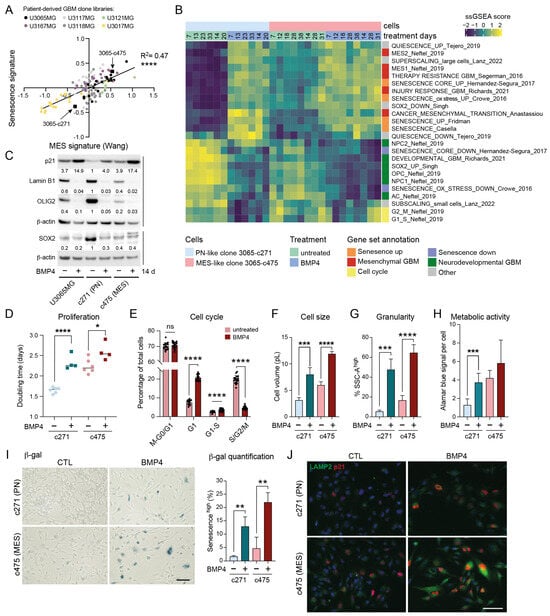 MES-like GBM cells display elevated senescence-associated features compared to PN-like GBM cells. (A) A correlation plot of senescence (Fridman, 72 up-regulated genes) and therapy-resistant gene signature scores [6] in 114 GIC clones from five patient tumors (U3167MG, U3117MG/U3118MG, U3121MG, U3065MG, and U3017MG). Signature score was calculated by taking the mean of all individual gene z-scores. ****, p ≤ 0.0001. (B) A heatmap showing ssGSEA data using the same gene sets as in Figure 1K. (C) Western blot analysis of the parental cell line U3065MG and its clonal derivatives 3065-c271 (PN-like) and 3065-c475 (MES-like) cells treated +/−BMP4 for 14 days. The quantification of protein-band intensities is shown, with values normalized to β-actin levels. 3065-c271 was used as reference for comparison. (D) The doubling time of 3065-c271 and 3065-c475 cells treated +/−BMP4 for 12–14 days *, p = 0.021; ****, p ≤ 0.0001. (E) A bar graph showing cell-cycle phase distribution of 3065-c475-FUCCI cells 30 h after +/−BMP4 addition. See Supplementary Figure S3F,G. (F–J) Cells treated for two weeks +/−BMP4. (F) Cell volume calculated from cell-diameter measurements. (G) Cellular granularity, with a SSC-A high cell population, as in Figure 1. *** = p ≤ 0.001; **** = p ≤ 0.0001. (H) Metabolic activity per cell measured by Alamar blue assay in combination with cell counting. (I) SA-β-gal staining—scale bar 100 µm, (left); and the quantification of the CellEventSenescence high cell population from three flow cytometry experiments (right). ** = p ≤ 0.01. (J) p21 and LAMP2 immunofluorescence staining—scale bar 50 µm.