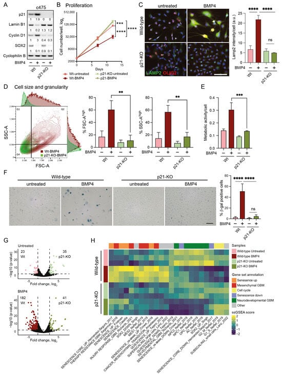 Cell-size enlargement and senescence-like induction by BMP4 is dependent on p21. (A–H) Wild-type and p21 knockout (p21-KO) MES-like clone 3065-c475 cells, untreated or treated for 12–14 days with BMP4. (A) Western blot using antibodies against p21, lamin B1, cyclin D1, SOX2, and cyclophilin B. (B) Proliferation; cells counted on days 0, day 7 and day 12. Unpaired t-test, *** = p ≤ 0.001, ****, p ≤ 0.0001. (C) Immunocytochemistry using antibodies against LAMP2 and OLIG2 (left). The quantification of LAMP2 signal intensity per cell. Unpaired t-test, ****, p ≤ 0.0001; ns, not significant (right). (D) Flow cytometry analysis of cell size and granularity using FSC-A and SSC-A measurements, respectively (left); and the quantification of FSC-A high and SSC high cell populations (indicated by lines in dot plot), ** = p ≤ 0.01 (right). (E) Metabolic activity per individual cell. *** = p ≤ 0.001. (F) SA-β-gal staining photographs— scale bar 100 µm (left); and quantification, ****, p ≤ 0.0001; ns, not significant (right). (G) Volcano plots of differentially expressed genes (DEGs, 2 ≤ log2 fold difference and p ≤ 0.001, thresholds indicated by dotted lines) from wild-type and p21-KO c475 cells, comparing both untreated cells (top, 58 DEGs) and BMP4-treated cells (bottom, 223 DEGs). (H) A heatmap of ssGSEA-scores of c475 wild-type and p21-KO cells +/−BMP4. See also Supplementary Figure S5 for data on U3065MG wild-type and p21-KO.