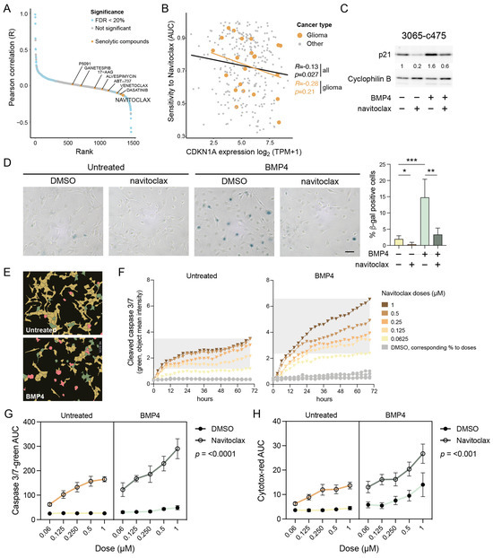 To identify potential therapeutic vulnerabilities in p21 high-expressing cells, we next performed a systematic correlation analysis using 1442 cancer cell lines from the Dependency Map dataset [https://depmap.org/portal/ (accessed on 20 April 2024)], integrating RNA expression with drug sensitivity profiles (area under the curve (AUC) values). This unbiased analysis revealed a significant anticorrelation between baseline CDKN1A/p21 expression and response to several senolytic agents, suggesting that high p21 levels confer sensitivity to these treatments (Figure 4A). Among these, navitoclax (ABT-263)—an inhibitor of anti-apoptotic Bcl-2/-XL/-w proteins—showed the strongest effect size (R = −0.13; p = 0.027) (Figure 4A,B). A similar trend was observed when the analysis was restricted to glioma cell lines only (Figure 4B).