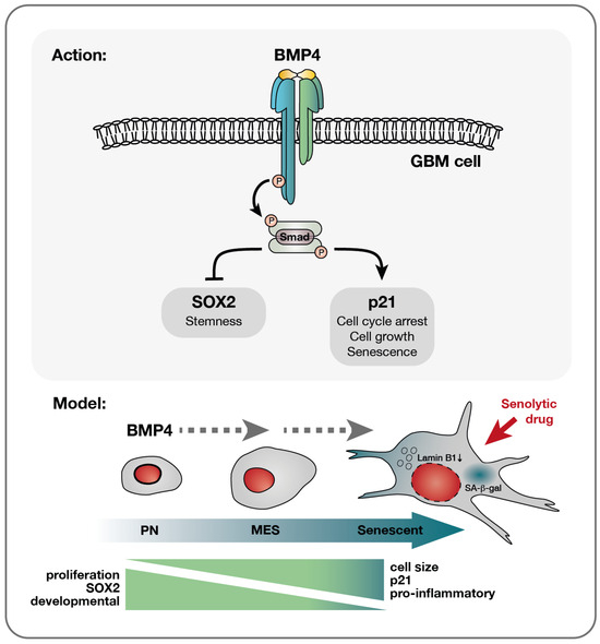 BMP4 has also been shown to induce cellular senescence—a state of permanent cell-cycle arrest—in lung cancer cells [15], but its potential to trigger senescence in GBM remains underexplored. This represents a critical knowledge gap, particularly given the dual role senescence can play in cancer progression (reviewed in [16]). Senescence can be induced by various factors, including telomere shortening, oncogene activation, radiation, oxidative stress, chemotherapy, cell enlargement, and cytokine signaling [17,18,19,20,21,22,23,24]. While senescence can serve as a tumor-suppressive barrier by halting the proliferation of damaged cells, it also contributes to a pro-tumorigenic environment through the senescence-associated secretory phenotype (SASP)—a collection of inflammatory cytokines, proteases, and extracellular matrix components (reviewed in [25]). These SASP factors can promote tumor growth and recurrence. Similarly, therapy-resistant MES-like GBM cells secrete SASP-like factors [4], linking therapy resistance to pro-inflammatory signaling. Whether and how BMP4 influences the interplay between MES-like and senescent GBM cell states remains unclear.
