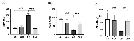 Effects of macrophage depletion on oxidative stress biomarker levels in kidney tissue of rats with streptozotocin/high-fat diet (STZ/HFD)-induced nephropathy. Data are expressed as mean ± standard error of the mean (SEM; n = 6 samples per group; each sample represents a different rat). Group comparisons were performed using one-way ANOVA, followed by a Tukey–Kramer post hoc test. ** p < 0.01 and *** p < 0.001 indicate statistical significance compared with the diabetic model group; ### p < 0.001 indicate statistical significance compared with the healthy control group. (A) Malondialdehyde [MDA]; (B) superoxide dismutase [SOD]; (C) glutathione peroxidase [GPx]. Abbreviations: CN, normal control group; CD, diabetic control group; CLN, liposomal clodronate-treated nondiabetic group; CLD, liposomal clodronate-treated diabetic group.