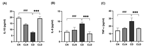 Compared with the control group, there was a significant decrease (p < 0.001) in IL-10 level (19.64 ± 0.41 vs. 7.68 ± 0.29 pg/mL) and a significant increase (p < 0.001) in IL-6 (4.96 ± 0.31 vs. 8.71 ± 0.27 pg/mL) and TNF-α (14.21 ± 1.39 vs. 26.57 ± 1.74 pg/mL) levels in the diabetic group (Figure 2A–C). However, LC treatment significantly increased IL-10 levels to 19.1 ± 0.60 pg/mL and decreased (p < 0.001) IL-6 and TNF-α to 4.19 ± 0.39 and 17.08 ± 0.32 pg/mL, respectively, compared with the diabetic model group (Figure 2A–C; Table S1K–M).