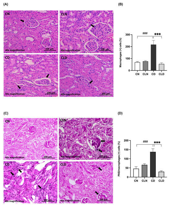Assessment of histopathological changes in the kidneys of rats with streptozotocin/high-fat diet (STZ/HFD)-induced type 2 diabetes using hematoxylin and eosin (H&E) and periodic acid–Schiff (PAS) staining. (A,B) Photomicrographs of H&E-stained renal cortex of the rats, and quantification of the staining intensity. (C,D) PAS-stained renal cortex and quantification of macrophage-positive cells. Black arrows in (A) indicate cells with macrophage-like morphology observed in H&E-stained kidney section. In (C), black arrows point to PAS-positive cells with features consistent with infiltrating macrophages. Data are expressed as mean ± standard error of mean (SEM; n = 6 fields per slide; six slides per group). Group comparisons were performed using one-way ANOVA, followed by a Tukey–Kramer post hoc test. *** p < 0.001 indicates statistical significance compared with the diabetic model group; ### p < 0.001 indicates statistical significance compared with the healthy control group. Magnification = 40×. Abbreviations: CN: normal healthy control group; CD: diabetic control group; CLN: liposomal clodronate-treated nondiabetic group; CLD: liposomal clodronate-treated diabetic group.
