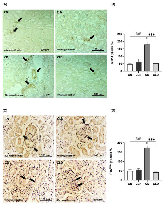 Effects of macrophage depletion on MCP-1 and P16INK4a expression in rats with streptozotocin/high-fat diet (STZ/HFD)-induced type 2 diabetes. Photomicrographs of rat kidney sections stained with either MCP-1 antibody (A) or P16INK4a antibody (C). Black arrows in (A) indicate MCP-1 positive cells identified by brown immunostaining in kidney sections. the black arrow in (C) highlight P16INK4a Positive cells showing brown cytoplasmic or nuclear staining. (B,D) Quantification of MCP-1- and P16INK4a-positive cells. Data are expressed as mean ± standard error of the mean (SEM; n = 6 fields per slide, six slides per group; each slide represents kidney tissue section). Group comparisons were performed using one-way ANOVA, followed by a Tukey–Kramer post hoc test. *** p < 0.001 indicates statistical significance compared with the diabetic group; ### p < 0.001 indicates statistical significance compared with the healthy control group. Magnification = 40×. Abbreviations: CN, normal control group; CD, diabetic control group; CLN, liposomal clodronate-treated non-diabetic group; and CLD, liposomal clodronate-treated diabetic group.