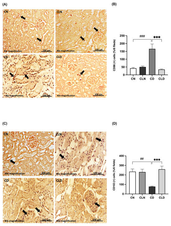 Effect of liposomal clodronate on the expression of M1 and M2 macrophage markers in rats with diabetic nephropathy. Photomicrographs of rat kidney sections stained with either CD86 antibody (A) or CD163 antibody (C). Black arrows in (A) indicate CD86-positive (M1) macrophages, while arrows in (C) highlight CD163-positive (M2) macrophages. (B,D) Quantification of CD86- and CD163-positive kidney cells. Data are expressed as mean ± standard error of the mean (SEM; n = 6 fields per slide, six slides per group; each slide represents kidney tissue section). Group comparisons were performed using one-way ANOVA, followed by a Tukey–Kramer post hoc test. *** p < 0.001 indicate statistical significance compared with the diabetic control group; ### p < 0.001 and ## p < 0.01 indicate statistical significance compared with the diabetic control group. Magnification = 40×. Abbreviations: CN, normal control group; CD, diabetic control group; CLN, liposomal clodronate-treated nondiabetic group; CLD, liposomal clodronate-treated diabetic group.