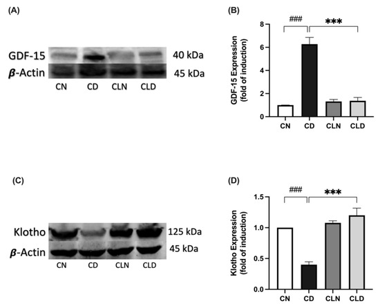Effect of liposomal clodronate (LC) treatment on GDF-15 and Klotho expression in rats with streptozotocin/high-fat diet (STZ/HFD)-induced type 2 diabetes. Representative immunoblot of the GDF-15 antibody (A) or Klotho antibody (C) was selected from six biological replicates (n = 6/group). Full unprocessed immunoblot replicates are provided in Supplementary Figure S1. (B,D) Quantification of GDF-15-1 and Klotho expression levels. Data are expressed as mean ± standard error of the mean (SEM; n = 6 samples per group; each sample from a different rat per group). Group comparisons were performed using one-way ANOVA, followed by a Tukey–Kramer post hoc test. *** p < 0.001 indicate statistical significance compared with the normal control group; ### p < 0.001 indicates statistical significance compared with the diabetic model group, Magnification = 40×. CN, normal control group; CD, diabetic control group; CLN, liposomal clodronate-treated non-diabetic group; and CLD, liposomal clodronate-treated diabetic group.