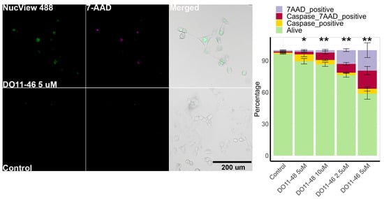 Cell death induction by DO11-46 and DO11-48. Images of cells stained with caspase 3/7 probe NucView 488 and dead cell stain 7-AAD. Quantitative analysis provided a graph for H1299 cells treated with 2.5 and 5 µM DO11-46 or 5 and 10 µM DO11-48 for 72 h. Experiments were repeated three times, and, for each repeat, 4 random images were taken using automated microscopy, and at least 100 cells were analyzed. * p-value < 0.05 and ** p-value < 0.01 as determined by two-tailed t-test.
