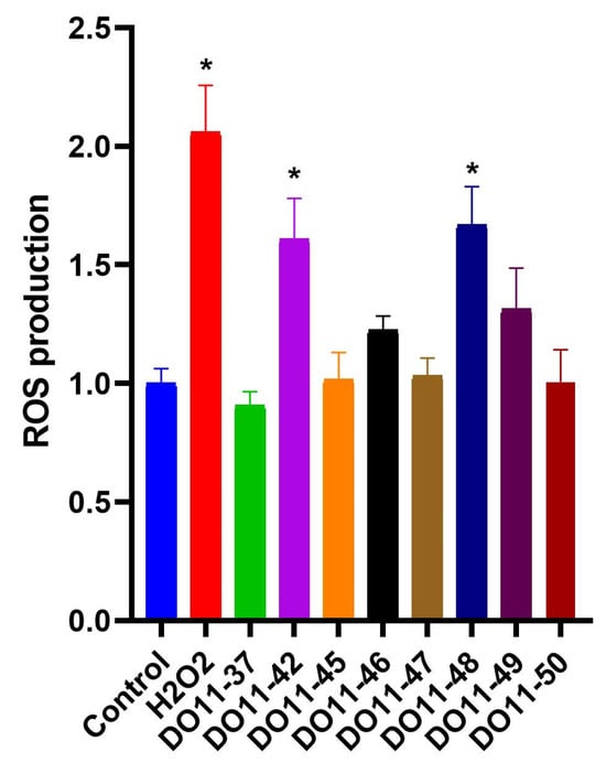 Reactive oxygen species (ROS) are byproducts of normal cellular metabolism and play dual roles: at low to moderate concentrations, ROS contribute to physiological processes, while at elevated levels, they can damage cellular components and induce cell death []. Tumors frequently generate high levels of ROS, contributing to DNA damage, genomic instability, and therapy resistance but also potentially promoting apoptosis under specific conditions []. Thus, we evaluated the ability of the compounds to generate ROS as a potential mechanism of apoptosis induction. Our studies showed that only DO11-42 and DO11-48 significantly increased ROS generation, while other toxic compounds did not affect cell redox status. We also assessed if the compounds trigger mitochondrial disfunction as these organelles are one of the main sources of ROS and play a critical role in intracellular oxidative stress []. Mitochondrial ROS can enhance membrane permeability, promote Ca2+ uptake, and release cytochrome c, initiating apoptosis []. To evaluate mitochondrial involvement, we assessed the mitochondrial membrane potential during treatment with DO11-46 or DO11-48. However, the results did not indicate significant changes or damage to the mitochondrial membrane. So, the antiproliferative activity of the compounds is not mediated via ROS production.