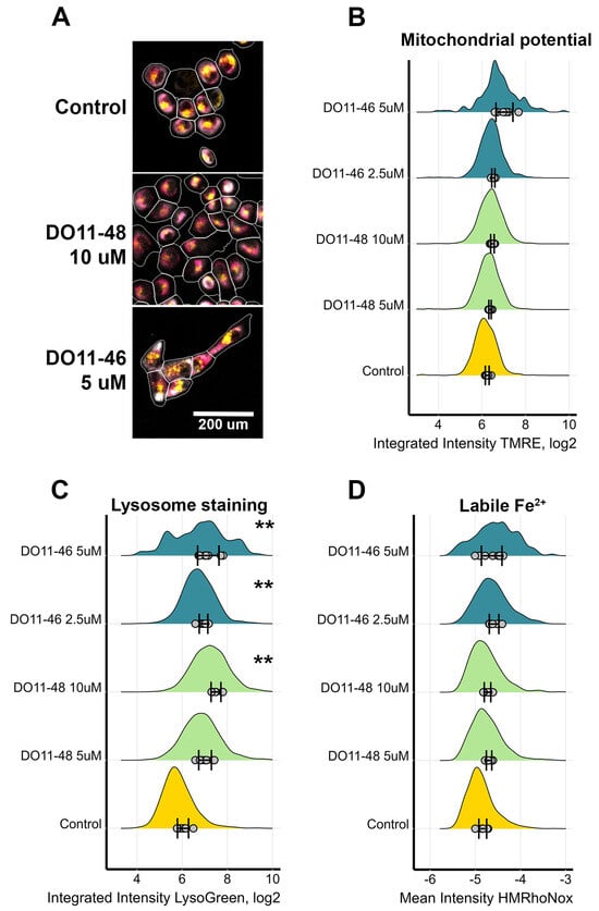 Measurement of mitochondria activity, labile Fe levels, and lysosomes accumulation in H1299 cells. (A) Images of cells treated with DO11-46 and DO11-48 for 72 h and then stained with potential-dependent mitochondria stain TMRE (magenta), lysosome stain LysoGreen (yellow), and tubulin stain Tubulin Tracker Deep Red (grey). Cell borders were identified using DNA-stain Hoechst-33342 and Tubulin Tracker Deep Red using Cellpose and CellProfiler. Identified cells are outlined in white. (B) Distribution of mitochondrial staining with TMRE. (C) Distribution of lysosome staining with LysoGreen. (D) Distribution of labile Fe2+ stained with HMRhoNox-M. Dots represent the mean values for each image, SD for the mean values across different images are shown, and distribution is computed based on overall number of cells, ranging from 500 to 4000 cells. Experiments were repeated three times, and, for each repeat, 4 random images were taken using automated microscopy, and at least 125 cells were analyzed. ** p-value < 0.01 as determined by two-tailed t-test.