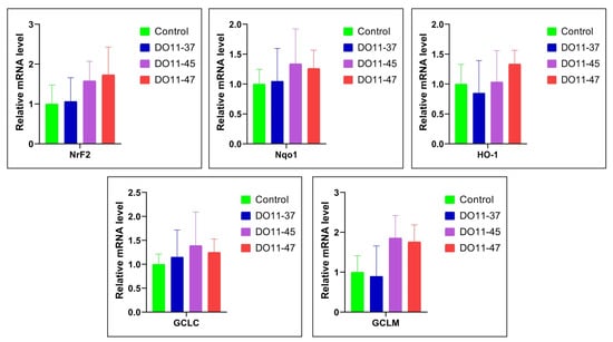 Changes in the expression of Nrf2, Nqo1, HO1, GCLC, and GCLM genes in A549 cells under the treatment of DO11-37, DO11-45, and DO11-47. Data are expressed as mean ± SD.