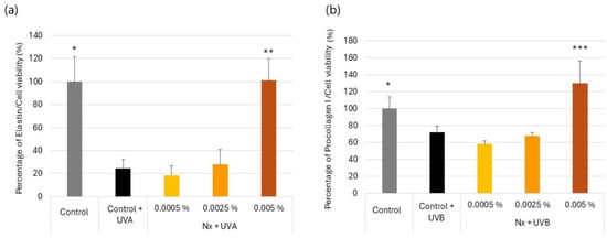 2.3. Effect of Nutroxsun® on the Secretion of Elastin and Procollagen Proteins in UVR-Exposed Human Dermal Fibroblasts