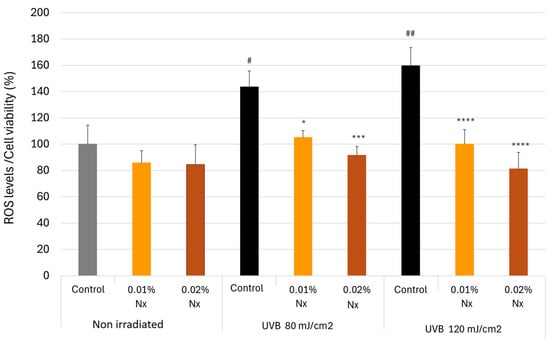 2.4. Impact of Nutroxsun® on ROS Generation in UVB-Irradiated Keratinocytes