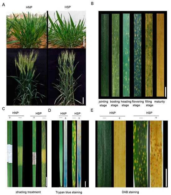 Under normal field conditions, no phenotypic differences were observed between HNP and HSP at the seedling or adult plant stages (Figure 1A). At the booting stage, spots first appeared near the leaf base and gradually spread toward the apex. These yellow, irregular spots expanded until they covered the entire leaf, progressing from the bottom to the top of the plant. As leaves senesced, they turned completely yellow and dry (Figure 1B). In HSP plants, the spots were confined to leaves, while HNP plants maintained green leaves until senescence.
