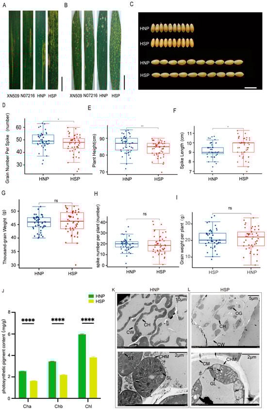 Evaluation of disease resistance, agronomic traits, and photosynthesis-related indicators between HNP and HSP. (A) The evaluation of stripe rust resistance for XN509, N07216, HNP, and HSP at field. Scale bar, 3 cm (B) The evaluation of powdery mildew resistance for XN509, N07216, HNP, and HSP at field. Scale bar, 4 cm. (C) Grain Width (GW) and Grain Length (GL) between HNP and HSP. Scale bar, 1 cm. (D) Mean grain number per spike between HNP and HSP. (E) Mean plant height between HNP and HSP. (F) Mean spike length between HNP and HSP. (G) Mean thousand-grain weight between HNP and HSP. (H) Mean spike number per plant between HNP and HSP. (I) Mean grain weight per plant between HNP and HSP. ns, p > 0.05; *, p < 0.05; **, p < 0.01; ****, p < 0.0001. (J) The photosynthetic pigment contents of HNP and HSP at flowering stage. Ch a: chlorophyll a; Ch b: chlorophyll b; Chl: chlorophyll, Error bars means + SD. The leaf cell structure and chloroplast structure of HNP (K) and HSP. (L) CH: chloroplast; CW: cell wall; CM: cytomembrane; CHM: Chloroplast membrane; ST: starch grain; SL: stroma lamella; GL: grana lamella; OG: osmiophilic globule.