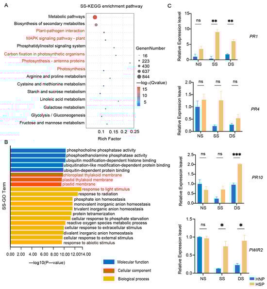 Enrichment analysis of DEGs. (A) KEGG enrichment analysis of DEGs in SS stage between HNP and HSP. (B) GO enrichment of down-regulated DEGs between HNP and HSP in SS stage. (C) Expression of defense-related genes in HNP and HSP. The error bars represent the standard deviation (SD) between biological replicates. NS represents the stage of no spot, SS represents the stage of some spots just appeared and DS represents the stage of spots distributed on the whole leaf. ns, p > 0.05; *, p < 0.05; **, p < 0.01; ***, p < 0.001.