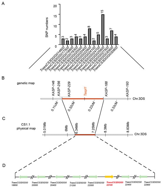 Previous studies showed SNP enrichment analysis using Euclidean distance from BSR-Seq identified a significant region with a maximum Euclidean distance of 2.0 at the distal end of chromosome 3DS []. Between markers SNP146 and SNP308, SNP distribution within interval genes was analyzed (Figure 4A, Table S3). To refine mapping, 5 KASP markers (Table S1) spanning the 5.01 to 11.58 Mb region were developed using the Chinese Spring reference genome v1.1. TaSpl1 was ultimately mapped between KASP188 and KASP229, with a genetic interval of 0.54 cM (Figure 4B). This candidate region, encompassing 0.91 Mb on chromosome 3DS (6.34–7.25 Mb; IWGSC RefSeq v1.1), contained 42 annotated genes, 14 of which were differentially expressed between HNPs and HSPs based on previous BSR-Seq data (Figure 4C). PCR amplification revealed base differences in eight genes, including TraesCS3D02G018800, TraesCS3D02G020000, TraesCS3D02G020400, TraesCS3D02G021200, TraesCS3D02G022000, TraesCS3D02G022100, TraesCS3D02G022400, and TraesCS3D02G022900 (Figure 4D, Table S4).