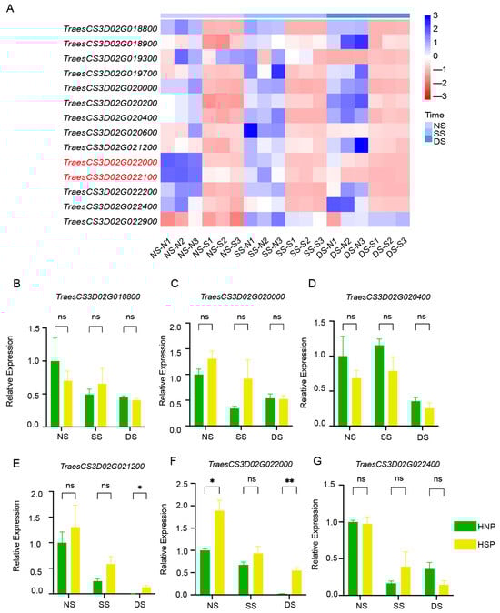Analysis of DEGs in regions. (A) The heatmap of 14 DEGs between HNP and HSP in the fine mapping region of 0.54 cM in 3DS. (B–G) Relative expression of gene TraesCS3D02G018800, TraesCS3D02G020000, TraesCS3D02G020400, TraesCS3D02G021200, TraesCS3D02G022000, and TraesCS3D02G022400 between HNP and HSP. ns, p > 0.05; *, p < 0.05; **, p < 0.01.