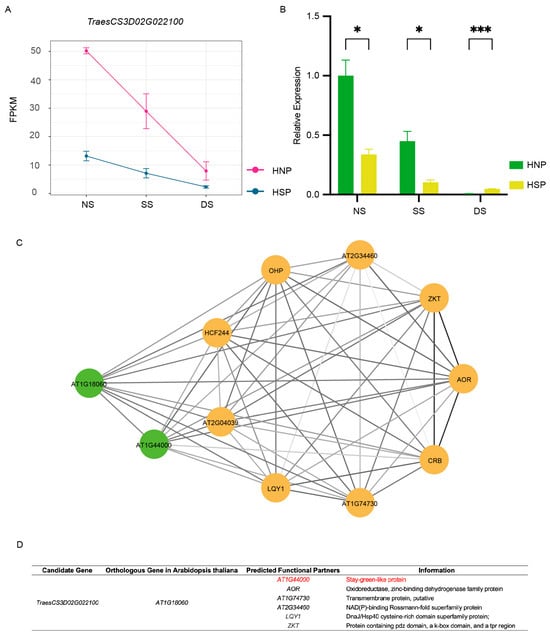 TraesCS3D02G022100 displayed a consistent downregulation trend across all three growth periods, which agreed with the FPKM results (Figure 6A,B). Conversely, TraesCS3D02G022900 exhibited discrepancies between qRT-PCR and RNA-Seq data (Figure S4A,B). Associated fibrillin conserved domain-containing protein based on the UniProt Knowledgebase,; no functional studies on this gene have been reported thus far. Using the WheatOmics 1.0 HomologFinder tool, AT1G18060 from Arabidopsis and LOC_Os01g03040 from rice were identified as homologous genes of TraesCS3D02G022100. Notably, AT1G18060 is chloroplast-localized and associated with a stay-green-like protein AT1G44000 (Figure 6C,D). These findings identified TraesCS3D02G022100 as a candidate gene for the spot phenotype.