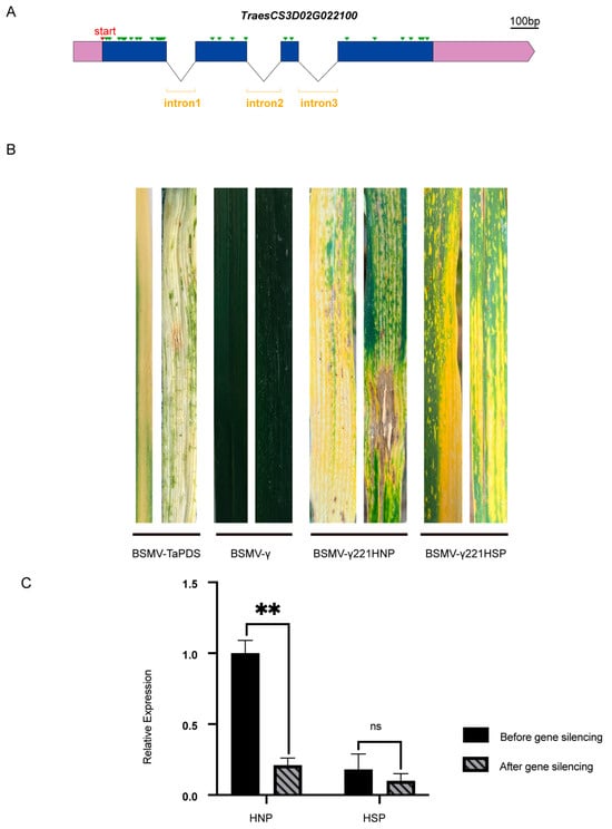 Gene structure and virus-induced gene silencing of candidate gene. (A) The gene structure of TraesCS3D02G022100. The green triangles represent single base difference between HNP and HSP. Scale bar, 100 bases. (B) The leaf color changes of BSMV-γ221HNP and BSMV -γ221HSP after 15 days of TraesCS3D02G022100 silencing. BSMV-γ0 and BSMV-TaPDS were controls. (C) Comparison of gene silencing efficiency. ns, p > 0.05; **, p < 0.01.