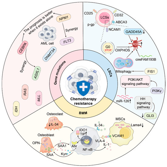 Chemotherapy resistance mechanisms in AML, divided into three main categories: genetic mutations, leukemia stem cells (LSCs), and the bone marrow microenvironment (BMM). Genetic mutations (e.g., MLL, FLT3-ITD, DNMT3A) alter cell proliferation, apoptosis, and survival signaling, contributing to resistance. LSCs, with their self-renewal and drug resistance properties, serve as a key source of resistance. The BMM exacerbates resistance through immune evasion, cell signaling, and nutrient support mechanisms. ↑: upregulation; ↓: downregulation.