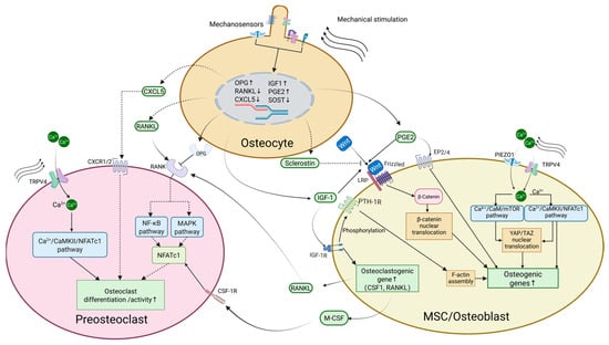 Overall, osteocytes act as central mediators of bone adaptation to mechanical loading, integrating multiple mechanosensitive pathways to regulate both osteoblast and osteoclast activity. Through a complex interplay of signaling molecules such as Wnt, IGF-1, and PGE2, mechanical stimuli orchestrate bone formation while simultaneously modulating bone resorption, ensuring skeletal homeostasis (Figure 1).