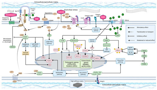 During the differentiation of monocytes into osteoclasts, primary cilia gradually diminish and eventually disappear [122]. Interestingly, treating macrophages with fenoldopam mesylate, a selective dopamine D1 receptor agonist that promotes cilia growth, significantly reduced the expression of osteoclast marker genes and inhibited osteoclast differentiation. However, directly applying mechanical stimulation to macrophages did not notably affect the expression of genes related to osteoclast differentiation [122].