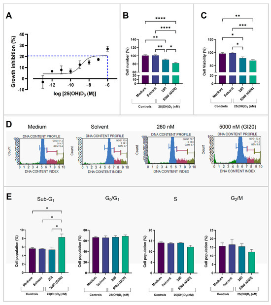 Growth inhibition curve and cell health parameters. (A) Growth inhibition curve of HeLa cells treated with log concentrations of 25(OH)D3. Growth inhibition at 5.0 × 10−6 M was 20% (blue dashed line). (B) Cell counts of HeLa cells enumerated with crystal violet staining and (C) cell viability quantified with the alamarBlue assay. (D) Histogram plots and (E) bar charts displaying percentage of HeLa cells in each phase of the cell cycle (sub-G1, G0/G1, S and G2/M). Data represent mean values from three biological replicates, each performed in technical triplicate. (* p < 0.05; ** p < 0.01; *** p < 0.001; **** p < 0.0001).